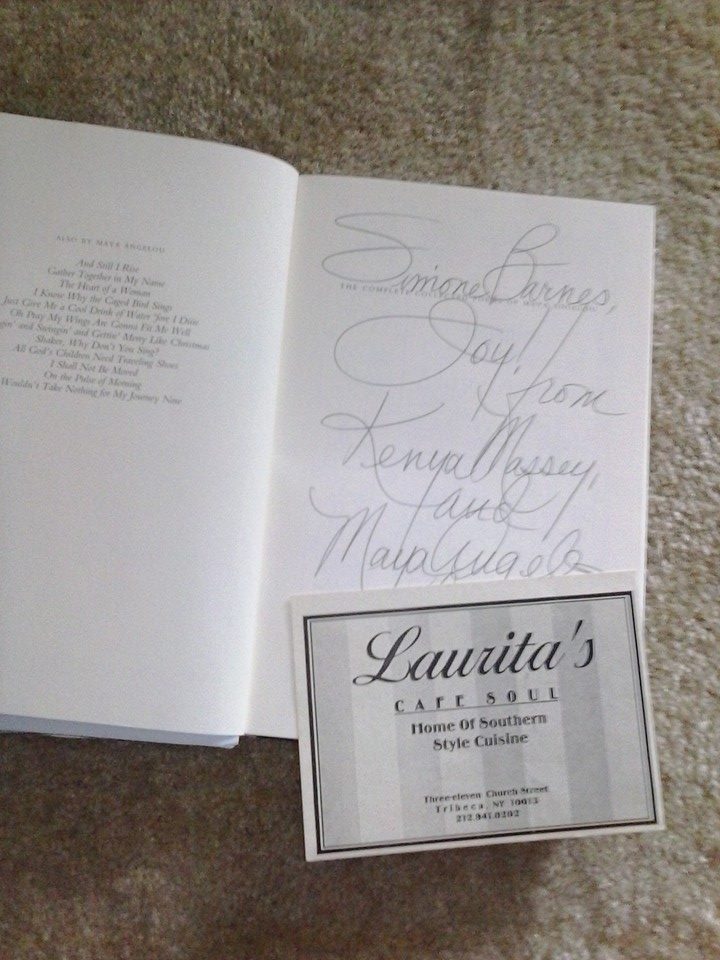 Dinner with friends at a tiny restaurant in Tribeca on my birthday in 1996. It was before peak hours, so the restaurant was nearly empty. My bestie Kenya Unique Massey gave me The Complete Collected Poems (Maya Angelou). It had been on my birthday/Christmas/Kwanzaa wish list for a while, so I was surprised (thrilled) to receive it. A few moments later Kenya gasps and goes eerily silent. Conversation at our table stops. What? “Oh my God, Maya Angelou just walked in.” The restaurant owner, during routine checks on her patrons’ dining experiences, overhears our conversation and the uncanny synchronicity (as well as the friendly frustration and disbelief at my hesitance to bother the icon while she’s enjoying her downtime), then comes over and says “Daughter come. Maya is waiting for you.” Kenya and I walk over to her table together and exchange a few humble words in hushed tones with our legend. Booked signed, “Simone Barnes, Joy! From Kenya Massey and Maya Angelou.”