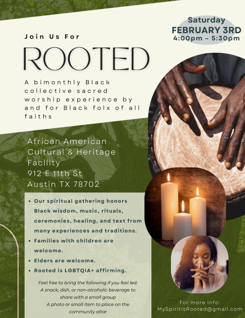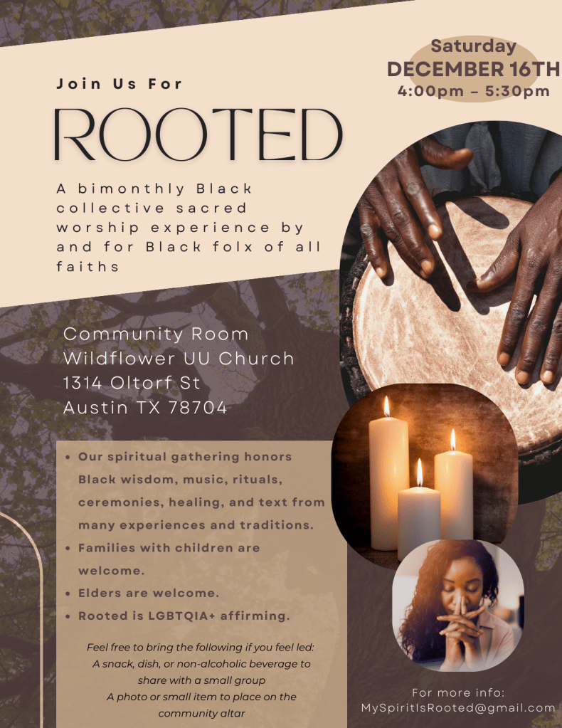Join us for Rooted, a bimonthly Black collective sacred worship experience by and for Black folx of all faiths.